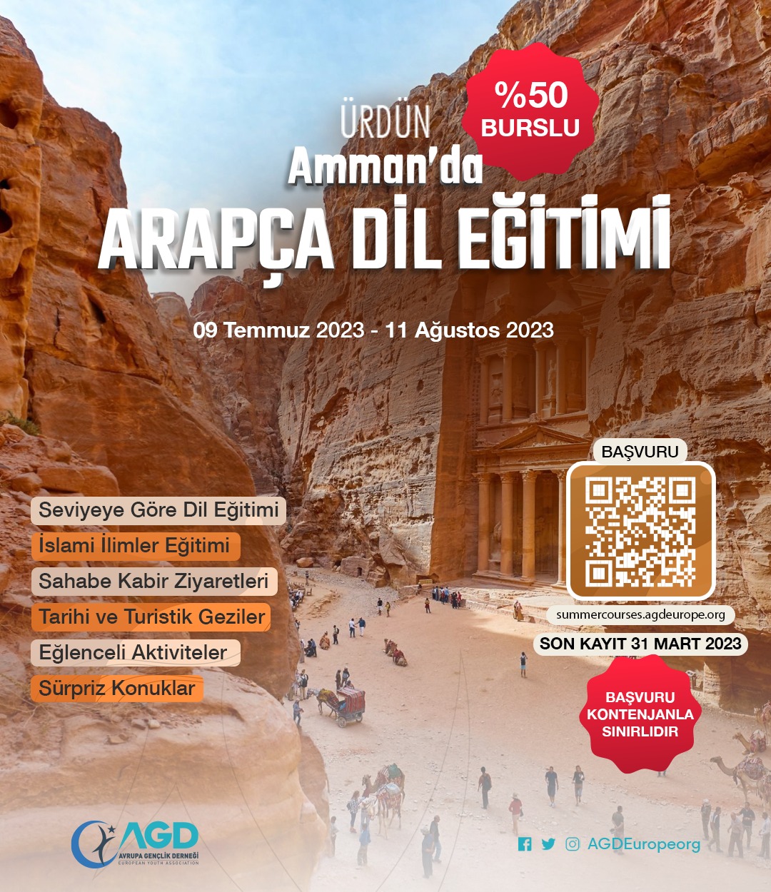 Ürdün’ün başkenti Amman’da yapacağımız Arapça Dil Eğitimi programımız bir dil eğitimi programı için bütün gereksinimleri sunmaktadır. Her günün dolu dolu geçeceği, yeni bir ufuk açacak programımız sizleri beklemektedir. Bir dil öğrenmek yeni bir kültürü keşfetme, yeni bir iş, yeni bir kariyer imkânı sunar. Arapça dili dünyada en çok konuşulan 5. dil konumundadır. Kökeni çok eski yıllara uzanan kadim dil Arapçayı öğrenmemiz, dinimizin kaynakları olan başta Kur’an-ı Kerim’i ve Hadis-i Şerifleri de anlamamız açısından büyük önem arz etmektedir.